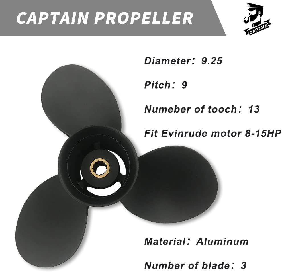 Engine Application: 2.50" Gearcase 8HP(4 Stroke)…1996-2005 9.9,15HP(2 Stroke)…1974-2005 9.9,15HP(4 Stroke)…1995-2001 9.9 / 15 HP(4 Stroke), 2002-thru 8-15HP,Match BRP,JOHNSON,EVINRUDE Propeller Size Diameter:9 1/4 Pitch: 11 Blade: 3 Number of splines:13 Material: Aluminum Rotation: Right Hand (RH) Before choosing a propeller, we recommend that you first confirm your propeller’s ★ Brand, ★ Diameter,★ Pitch,★ Rotation, ★ Spline Tooth, (6) OEM number(7) Matched engine date propeller (8) HP provided by the manufacturer before purchase. If you have any doubts, please contact us, we are honored to answer your questions